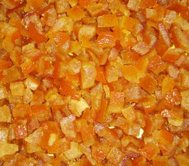 優(yōu)質(zhì)橙皮在工廠進(jìn)行糖漬干燥后進(jìn)行切丁,有6.4mm和4.8mm等規(guī)格。可用于月餅、面包、點(diǎn)心類的夾心,以其獨(dú)特的風(fēng)味成為秀愛的主打產(chǎn)品之一。